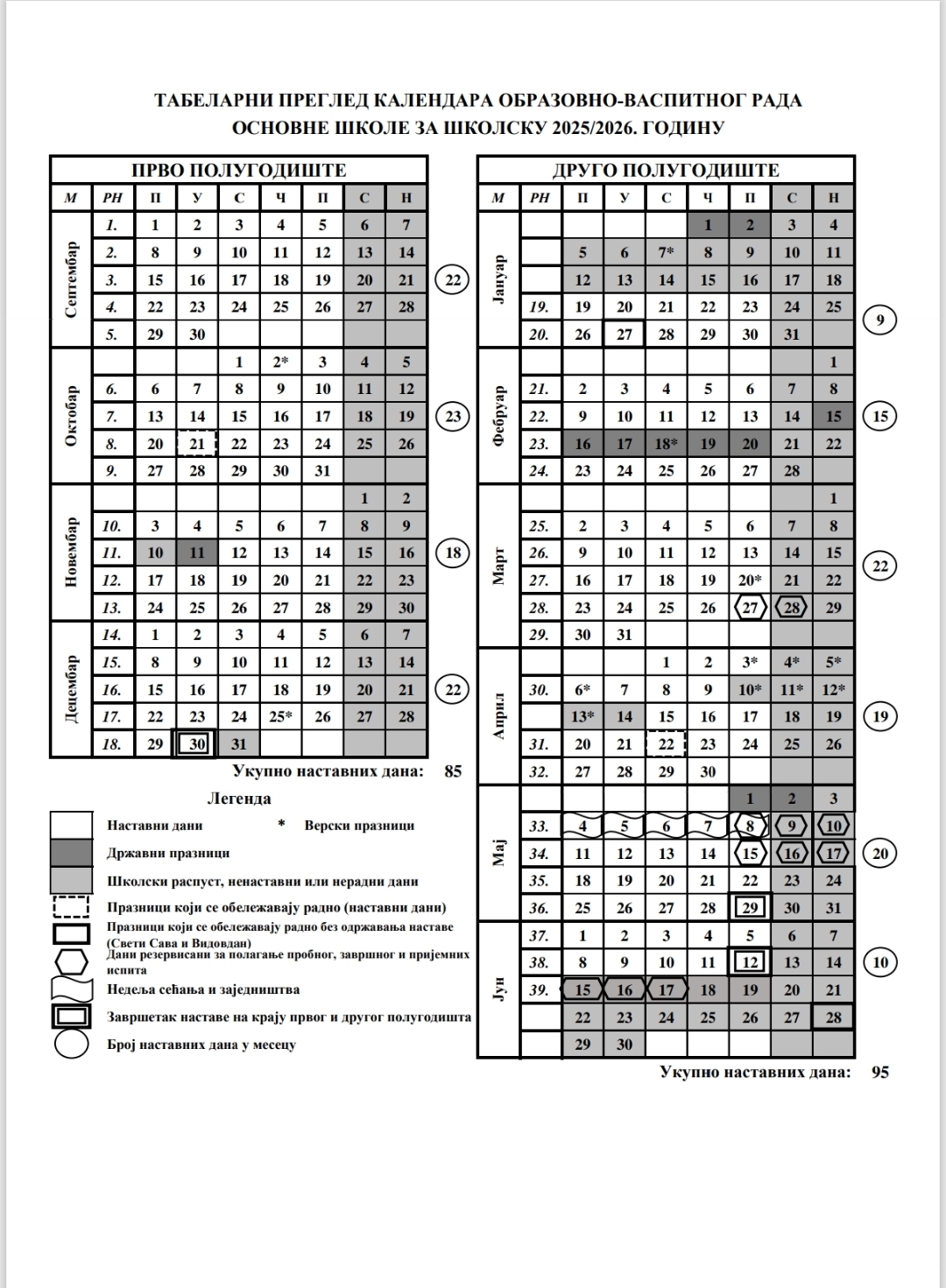 Настава и други облици образовно васпитног рада у основној школ остварују се у току два полугодишта.
